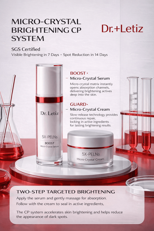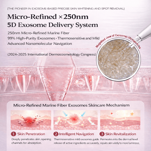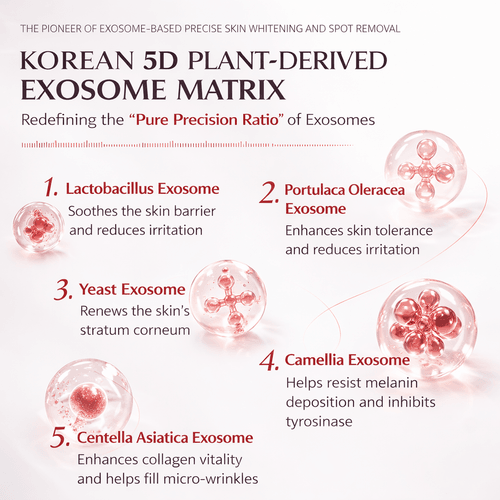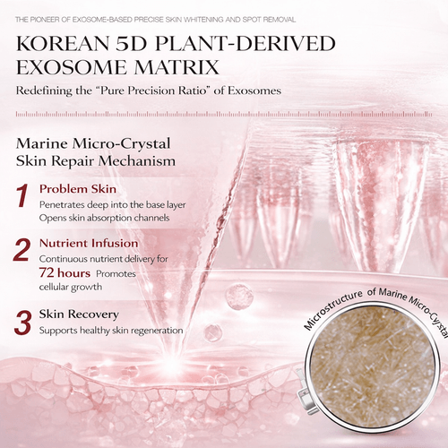 核心定位 (Core Positioning): 微晶开道,5D外泌体导航,经SGS人体临床测试验证,实现“美白+修护+抗初老”三重协同。 / Microcrystals clear the path, 5D exosomes navigate, validating the triple synergy of "Whitening + Repairing + Early Anti-Aging".