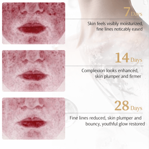 Q2. 需要多久才能看到肌肤的改善? / How long does it take to see improvements in the skin? A: 根据SGS的临床实证,连续使用14天即可感受到肌肤的修护与提亮;28天为一周期,肌肤紧致度显著提升,细纹淡化,呈现健康年轻光采。 According to SGS clinical evidence, you can feel skin repair and brightening after 14 days of continuous use. A full cycle is 28 days, after which skin firmness significantly improves, fine lines fade, and a healthy, youthful glow is revealed.