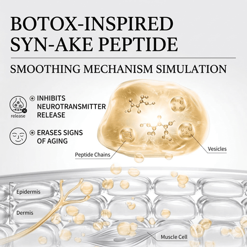 3. 类蛇毒胜肽 (Syn-Ake):涂抹式“肉毒素” / Syn-Ake Peptide: The Topical "Botox" Effect 模拟肉毒素阻断机制,针对动态纹(法令纹、抬头纹、鱼尾纹)进行“断电式”平滑。不打针也能享受紧致感,14天见证轮廓上扬。 Inspired by Botox mechanisms, it effectively "relaxes" dynamic wrinkles (nasolabial folds, forehead lines, crow's feet). Experience a firmer, lifted contour without the needles—visible results in just 14 days.